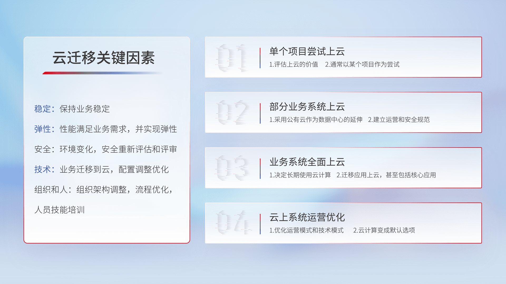 结合实际业务,,,从规划设计、、、、云平台选型、、、云原生改造、、、数据迁移、、集成交付,,迁移全过程为客户识别最佳上云路径,,,做好风险识别管理,,设计网络架构、、身份权限、、、安全审计合规、、操作审计、、、、日志审计、、、、监控告警策略、、、多站点容灾设计等,,对云上基础设施进行整体规划,,,,提升IT治理水平,,,以满足弹性、、高可用、、、高性能的需求。。